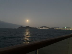 沈みゆく月の光が優しく降り注ぎます。その向こうに釜山の港が見えました。